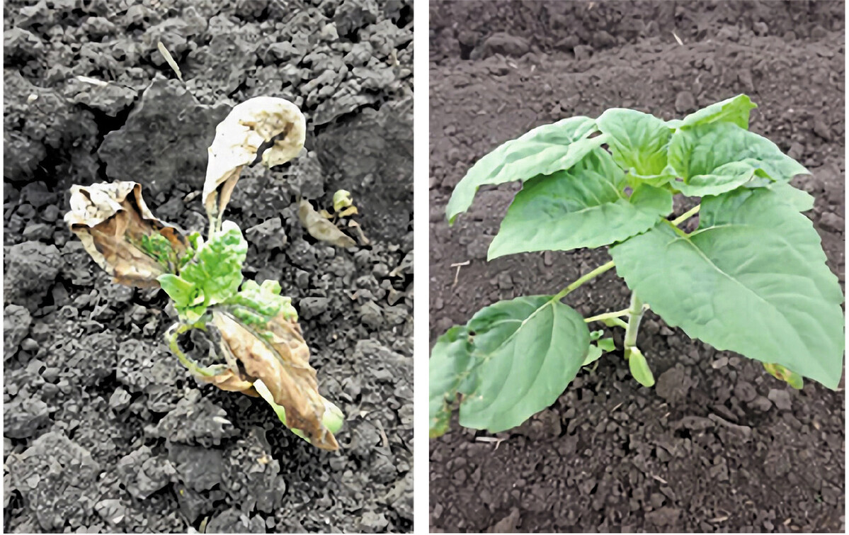 Рис. 2. Подсолнечник в Краснодарском крае: слева – обработка гербицидом, справа – обработка Ростком после ожога.